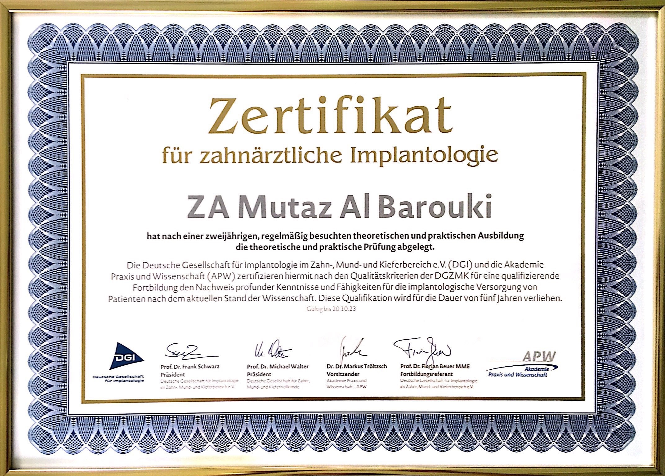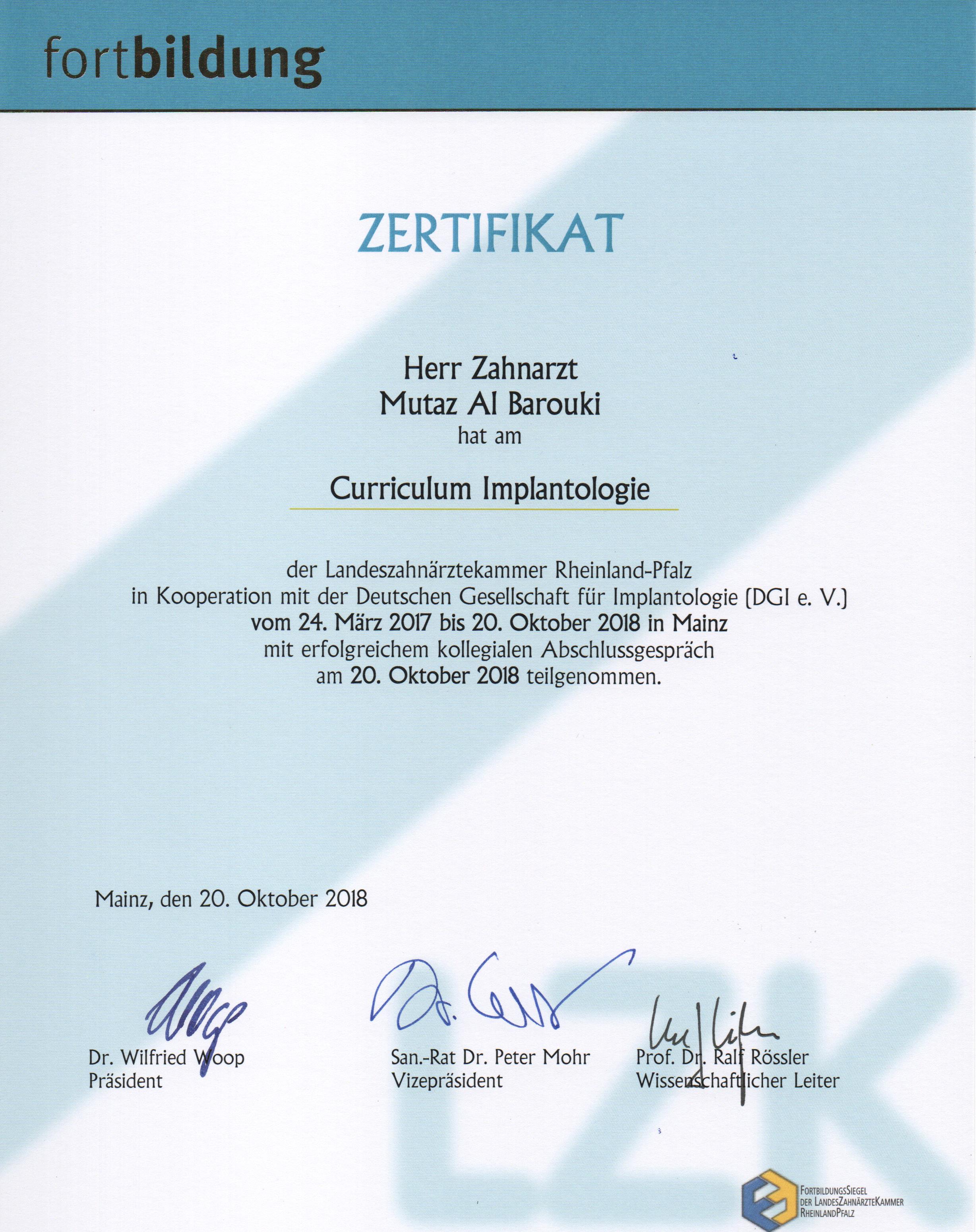 - 03/2017 bis 10/2018 Curriculum Implantologie der LZK Rheinland-Pfalz