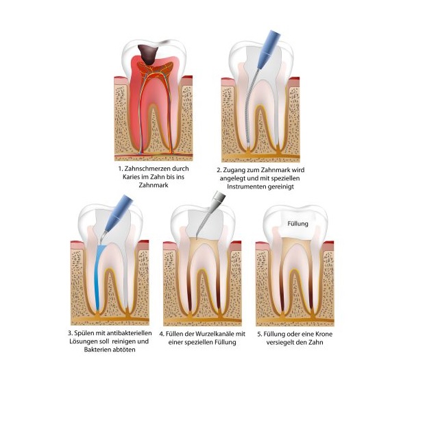 Während der Wurzelbehandlung werden also der Zahnnerv und die versorgenden Gefäße entfernt. Die entstehende Röhre, der sog. Wurzelkanal, muss vom Zahnarzt sehr gründlich von allen Gewebsresten gereinigt werden. Aber auch, wie es in den meisten Fällen nötig ist, von den Kariesbakterien, die sich in das Innere der Wurzel entlang dem Wurzelkanal ausgebreitet haben.